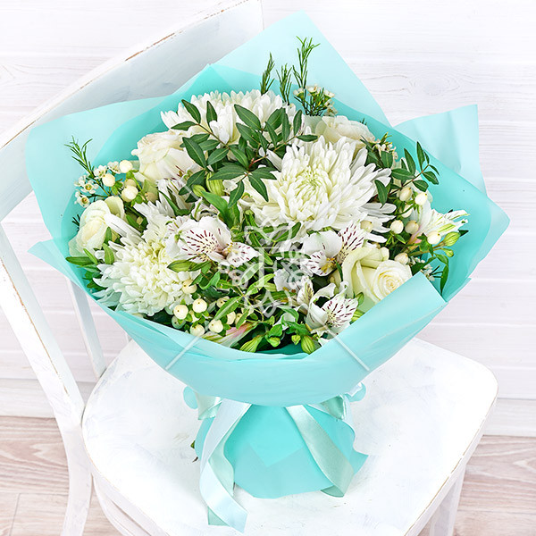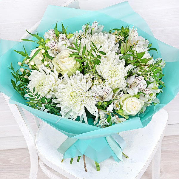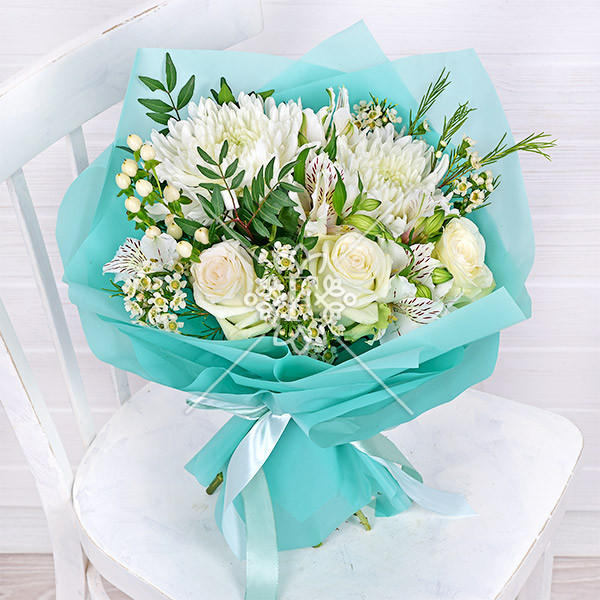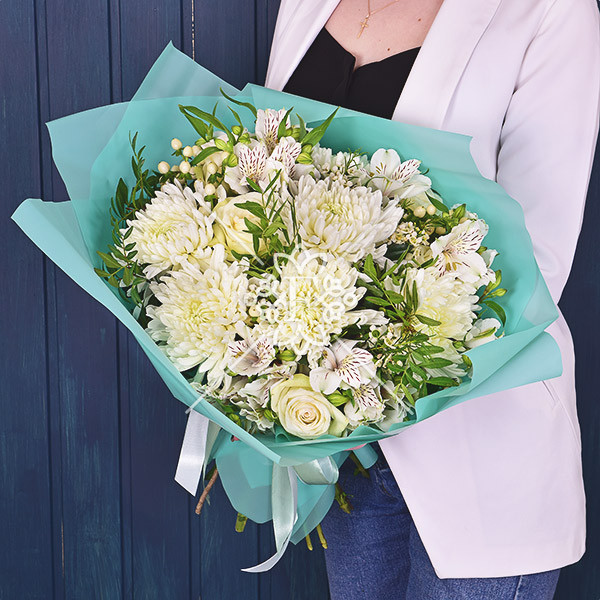 роза белая – 5 шт., альстромерия белая – 3 шт., хризантема белая одноголовая - 3 шт., гиперикум белый – 3  шт., зелень декоративная (фисташка), упаковка, лента.